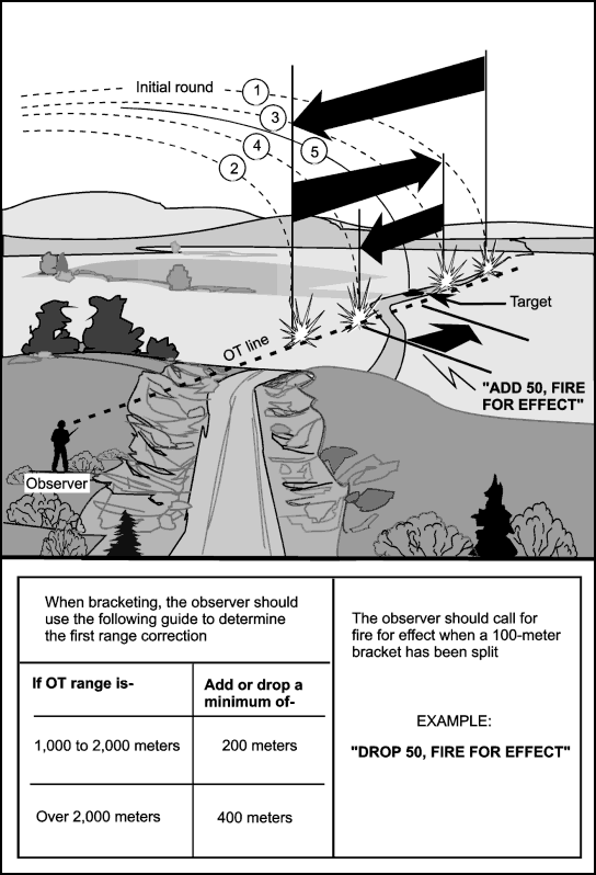 Let's assume you can see your first round. You would then give a left or right correction to get it in line with you and the target. With experience and with a good command of the ground you might couple it with an add or drop correction, the idea being that if you have a round in front of the target, you want to get the next round behind the target. You then continue to“bracket” the target by giving corrections that are half of your previous correction. You will continue the “bracketing”until you are on the target and you will then go into one round of fire for effect to see how the fall of shot from the entire battery looks. Once you get a good look at the coverage from the entire battery you may want to give a small correction and go into fire for effect, which would bring a much greater fall of shot.