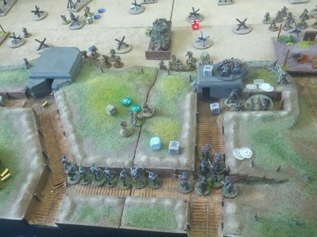 The artillery barrage did little to the Ostruppen, who shook off minimal pins they took, as they moved further down the trench, but it did do some pins to my Artillery Observer who was on top of the bunker.
