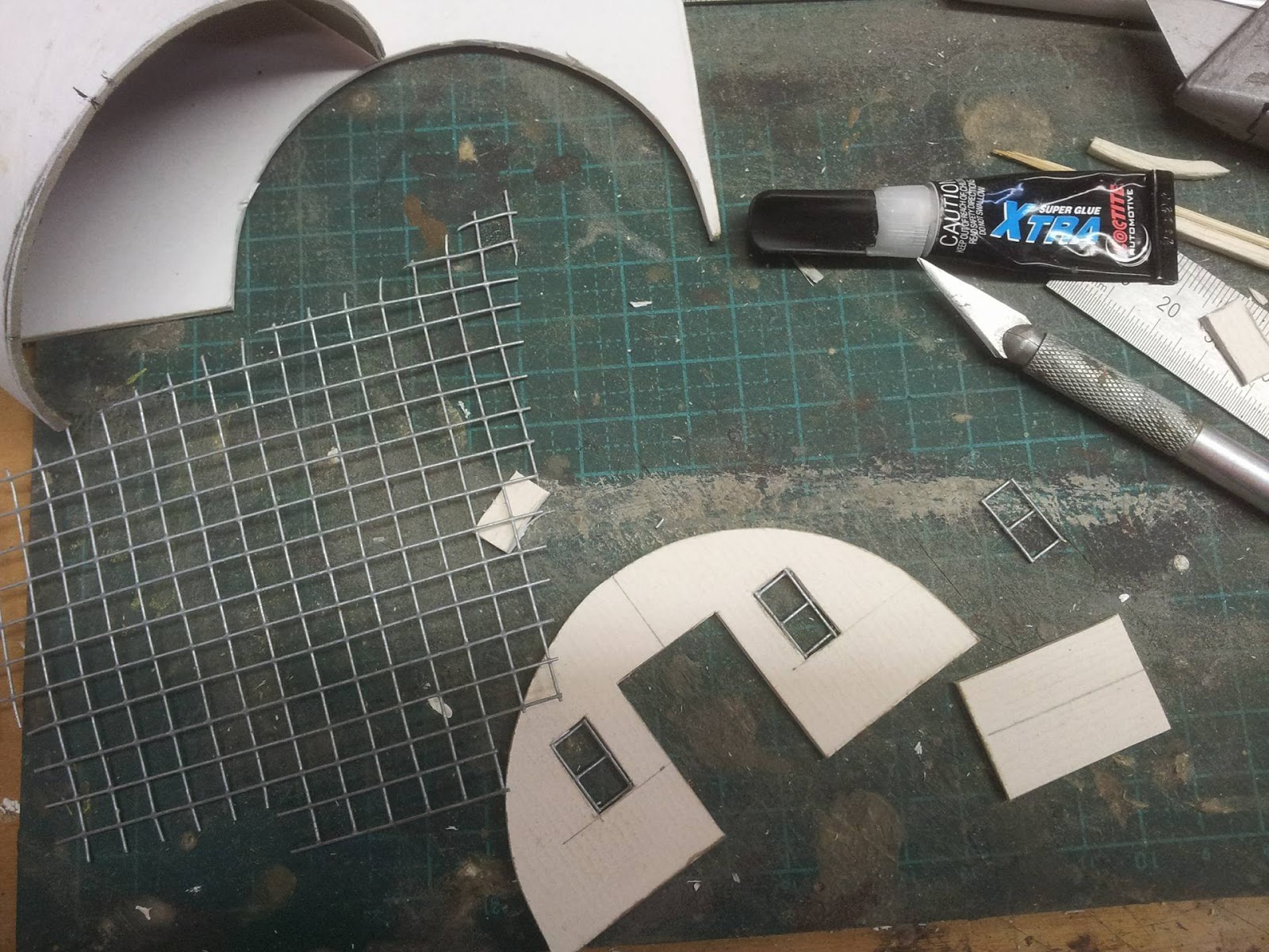 Glue and peg the top section of corrugated card on top, while it drys you can cut out the wire side windows, you'll need six 2x2 square frames.